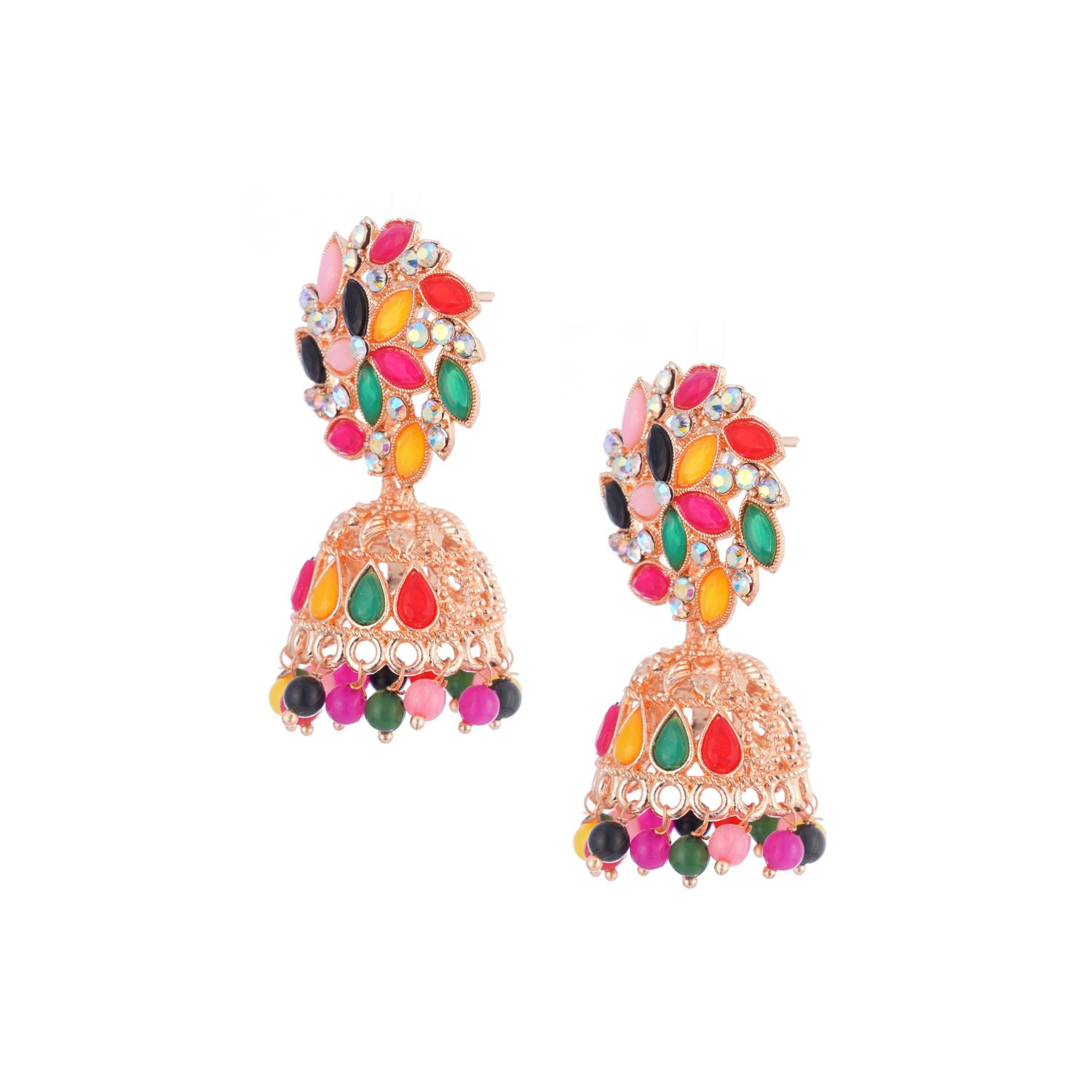 Designed to captivate, each earring features a floral motif at the top, encrusted with tear-drop shaped stones in rich shades of red, green, pink, orange, black, and more. The central floral element is adorned with shimmering faux kundan stones that give it a radiant finish. Suspended below is a beautifully carved jhumka dome, studded with matching multicolor stones, and finished with a row of dangling beads that add playful movement and festive flair.
