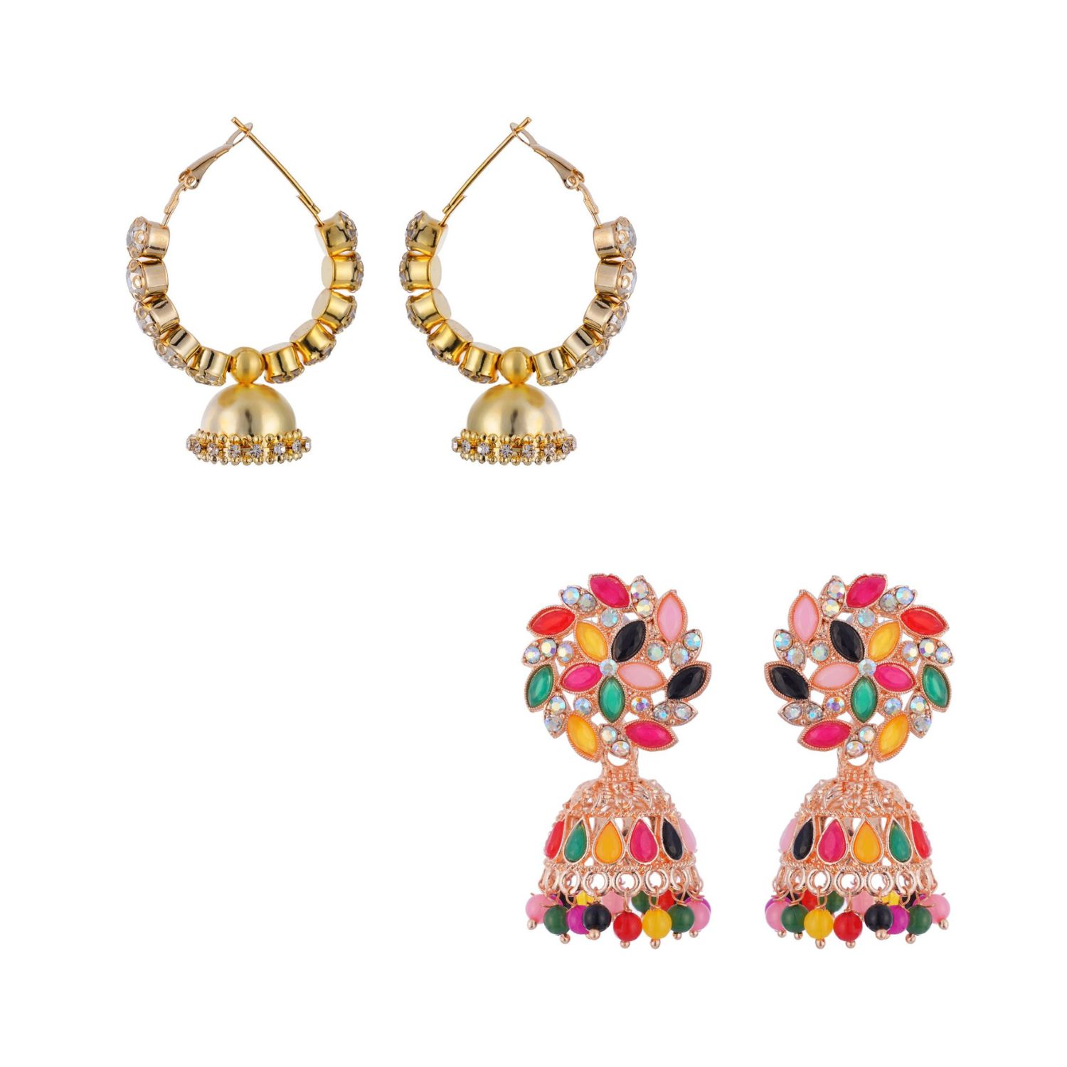 Buy this stunning combo set of traditional Indian jhumka earrings for women and girls featuring gold-finish hoops and vibrant multicolored crystal danglers. Perfect for weddings, festivals, and special occasions. Lightweight, elegant, and perfect for ethnic wear.