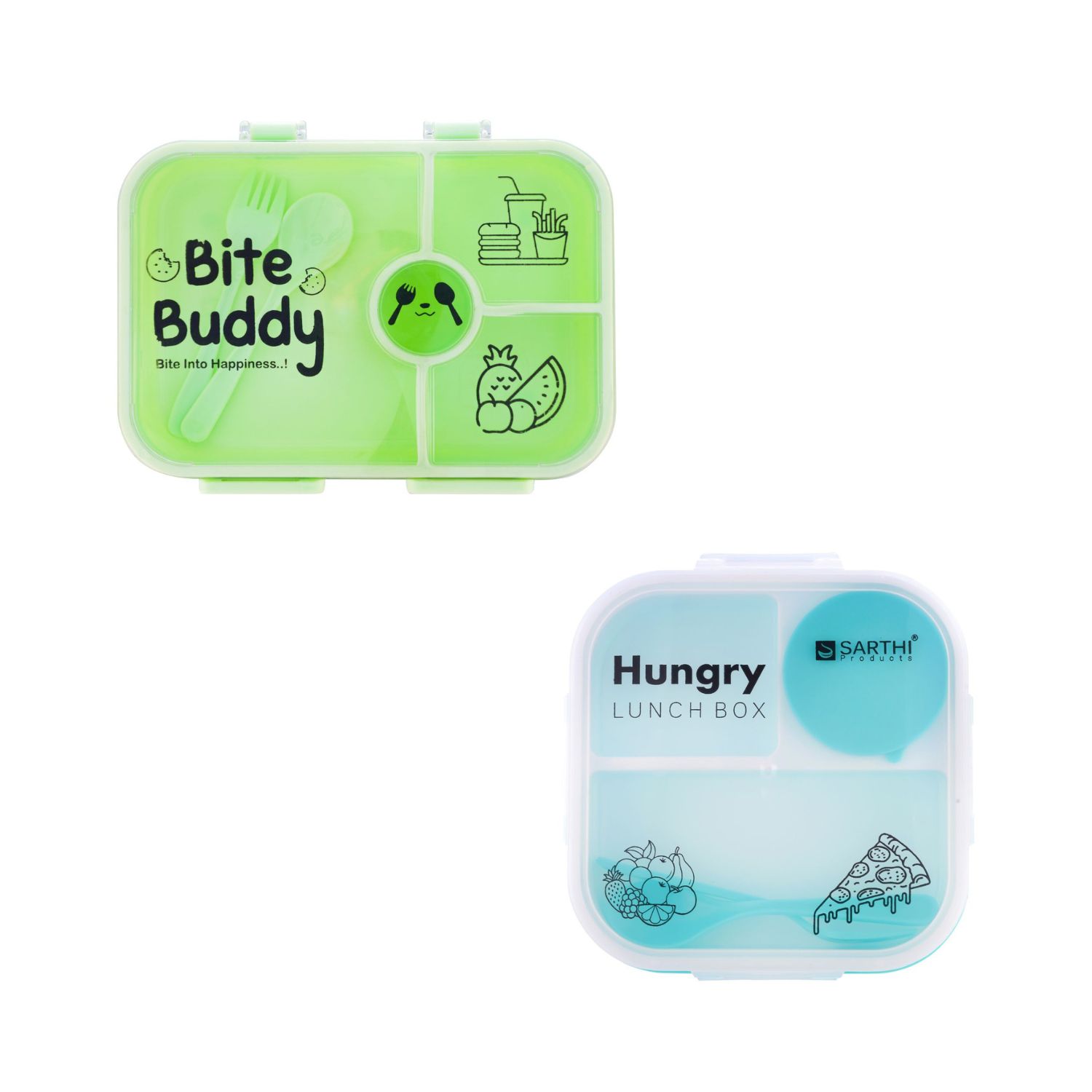 This combo includes two colorful lunch boxes – one in light green and the other in aqua blue – each with its own spoon and fork set, making it ideal for daily use. Designed with multiple compartments, they help organize food neatly while preventing mixing of items. The BPA-free material ensures food safety, while the leak-proof design helps avoid spills in bags.