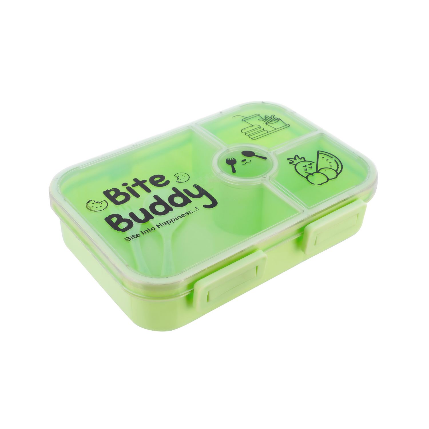 The lunch box comes with three neatly separated compartments and an additional round section ideal for sauces or small treats, allowing you to pack a balanced meal with variety—fruits, sandwiches, snacks, and dips—all in one container without mixing flavors. The tight-seal lid ensures freshness and prevents spills, while the snap locks make it easy for little hands to open and close securely.